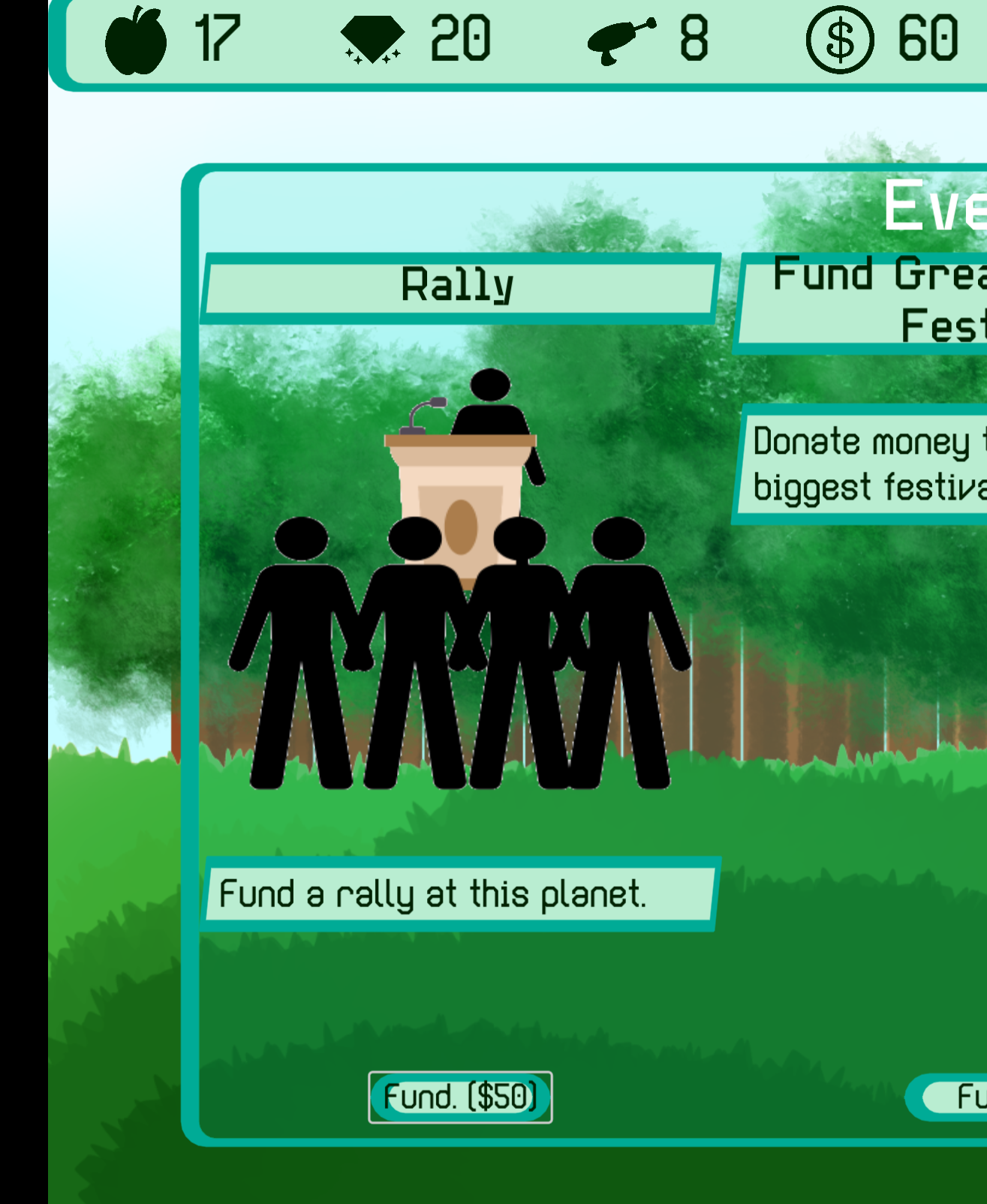 Welcome to Interplanetary Diplomat! A resource management game that is out of this freakin’ world!! Controls: Just your mouse! How To Play: Gain reputation to avoid being voted out on “Election Day” which happens every 40 days. Make it to the end of all election cycles in order to win! You may gain reputation by participating in various events at different planets in your role as a diplomat. Events usually require some kind of funding or supplying with either money or goods, respectively. Gain money by leveraging the goods that your home planet produces.